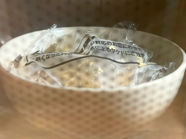 めんは内袋のまま皿にのせて5分~5分30秒加熱。パッケージ裏面の作り方では温め用の皿と丼を分けているが、私はいつも丼のまま温めてしまう。