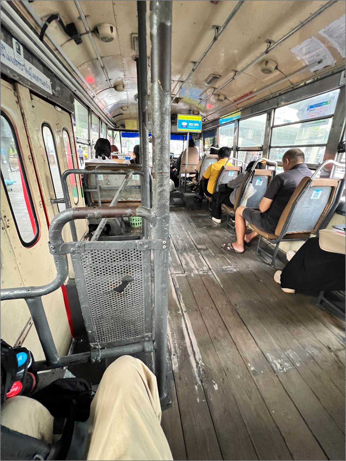 マッカサン駅から地上へあがり、次に使ったのはいわゆる市バス(赤バス)。車内の「床が木」の、最も安いバスである。価格は(16バーツ / 68円)。