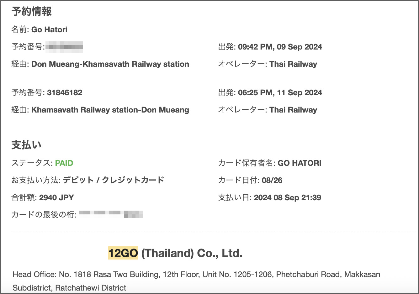 続いては、あらかじめ夜行列車(タイ〜ラオス国際列車)のチケットも予約しておいた。利用したのは12GOというサイトで、タイ・バンコクのドンムアン駅〜ラオス・カムサワート駅(ヴィエンチャン駅)往復を2940円(348.66バーツ /片道約1491円)で購入。