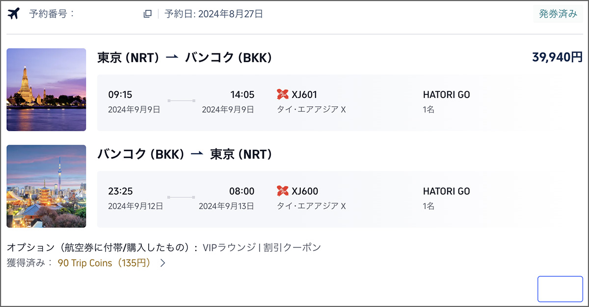 まずは航空券から。利用したサービスはTrip.comで、9月上旬発のLCC「タイ・エアアジアX」成田〜バンコク往復チケットを39940円にて購入。