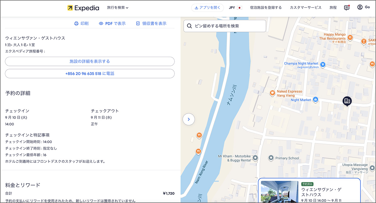 ということで、まずはExpediaにて、今回の目的地であるラオス・バンビエン(ヴァンヴィエン)の宿を予約。トイレ&シャワー付きシングルで、1泊1720円なり。