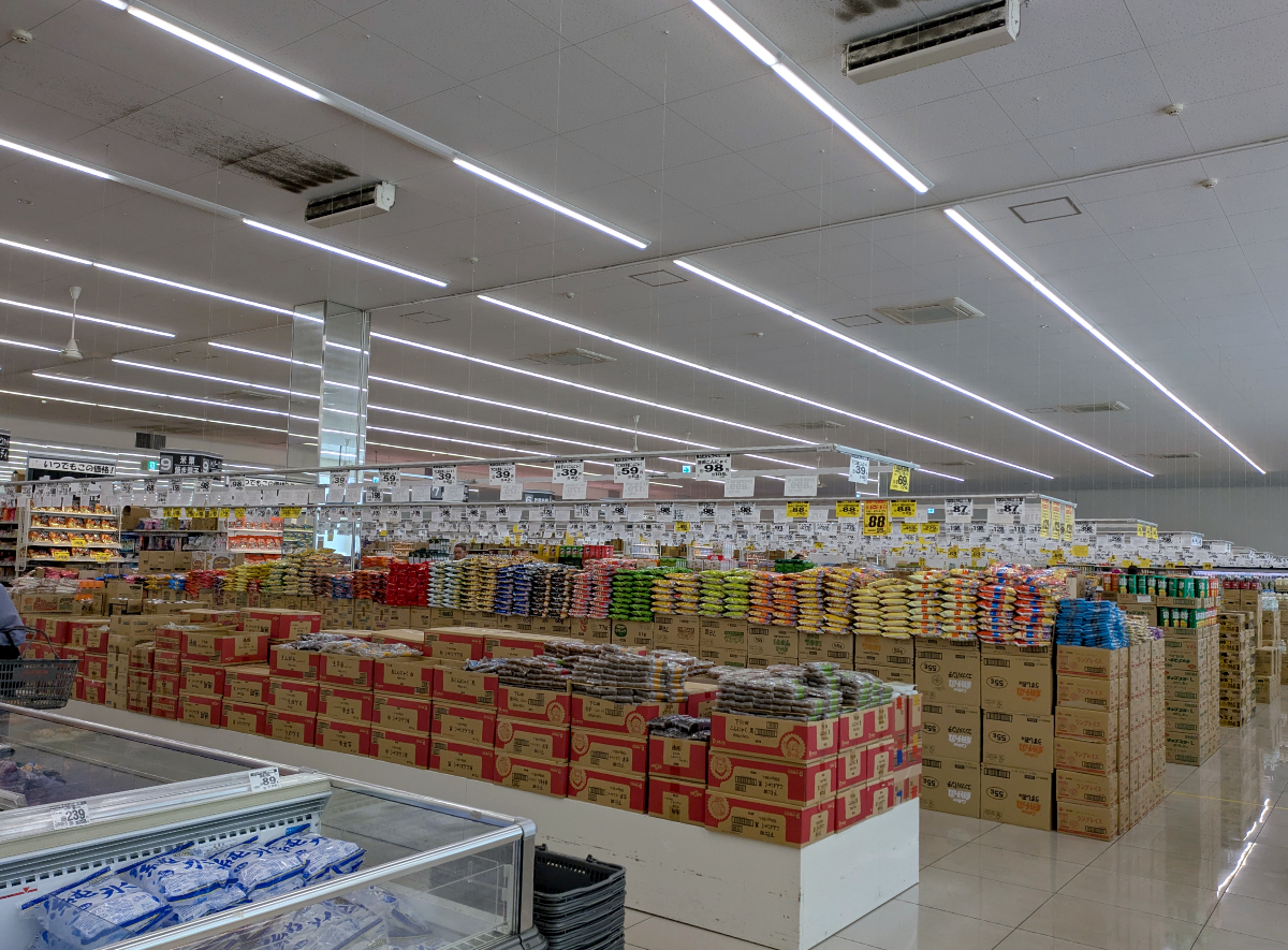さて、噂には聞いていたが、実際にお店に入るとその広さに驚かされる。まるで倉庫じゃないか! コストコとかジョイフル本田を彷彿させる。入口から反対端が見えないな。