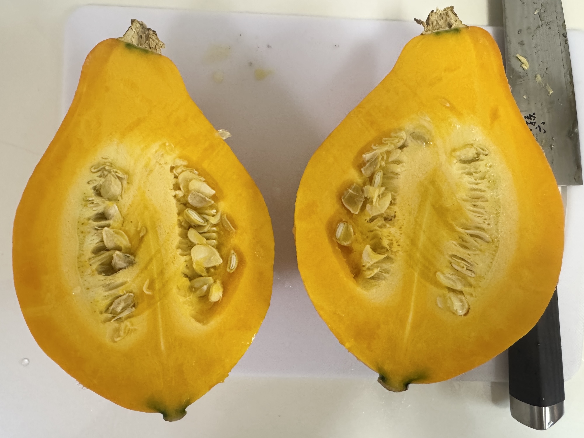 カボチャっておいしいんだけど、硬くて切りにくいのが難点ですよね? しかしいざコリンキーに包丁を入れると、メロンくらいのノリでスッ……と切れた。この時点で食べてもいないのに、もうコリンキーを好きになってる自分がいる。そもそも「コリンキー」とかいう名前からして超カワイイ。
