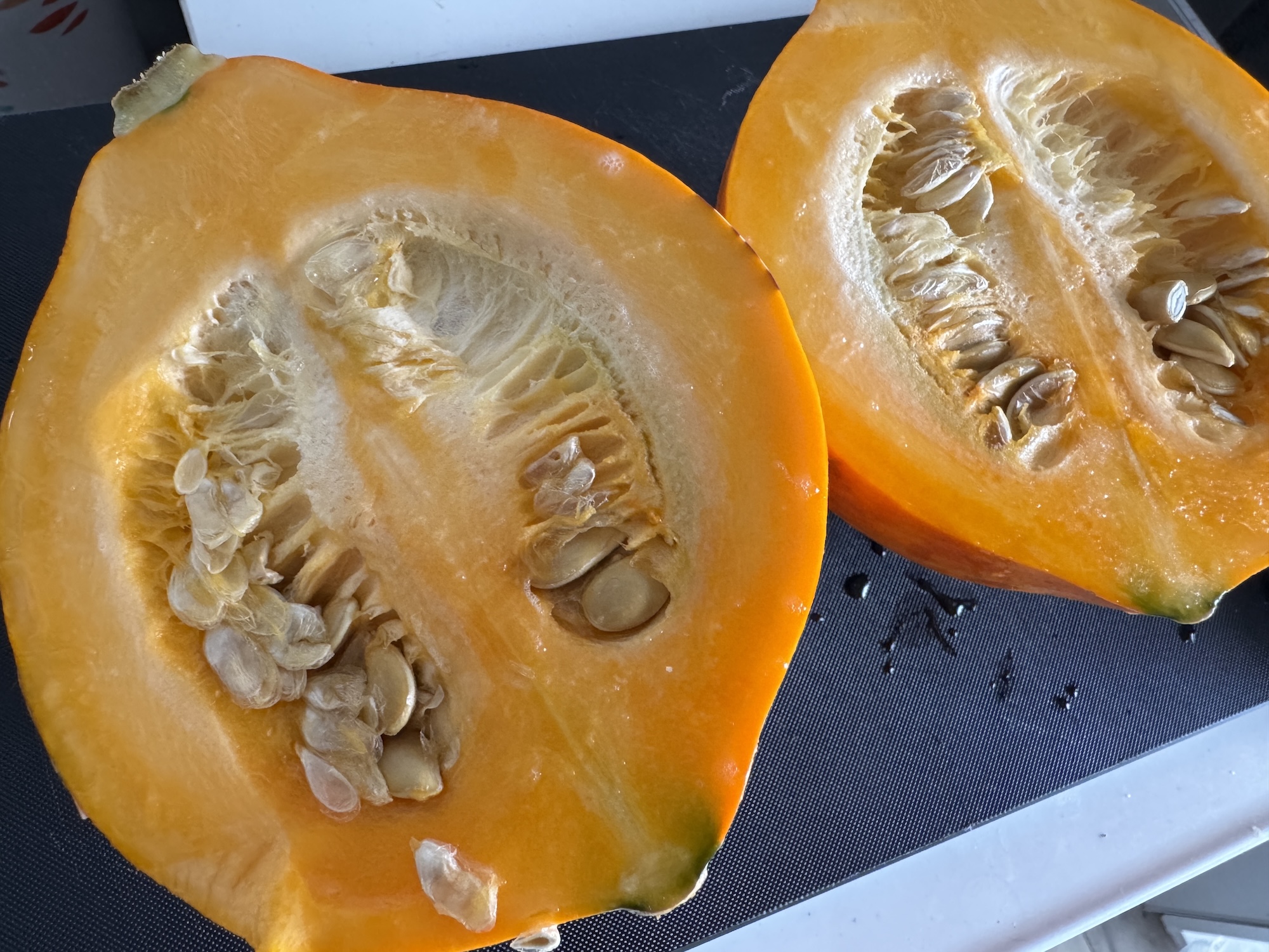 適切な切り方が分からないので、とりあえずタネを取って薄切りに。ジャガイモくらいの軽さでサクサク切れた。初めて食べるコリンキーの味は……