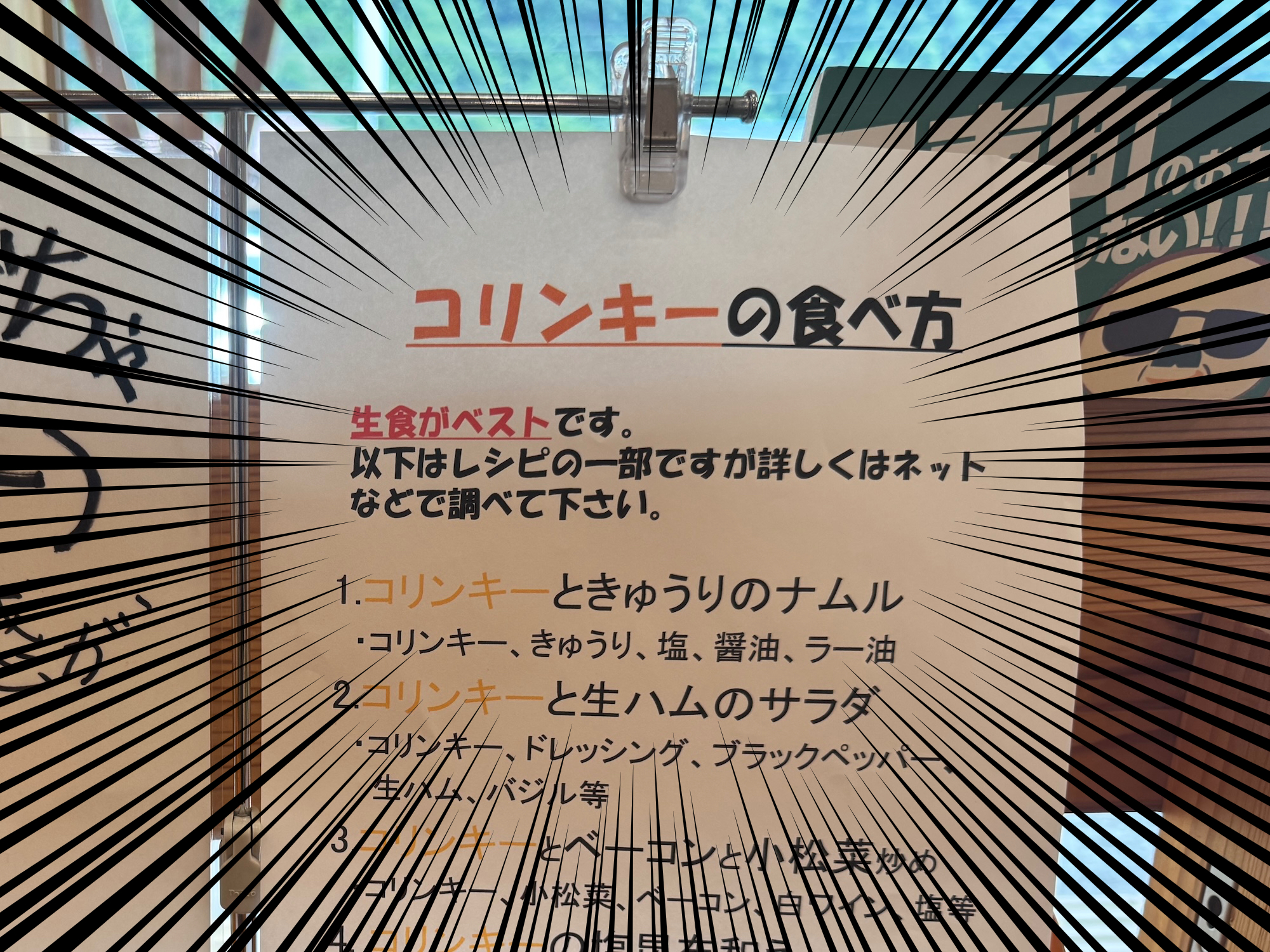 なおコリンキーの食べ方について、道の駅では店内ポップを張り出してくださっていたのだが……