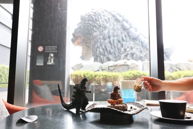 しかも、ラウンジではゴジラをテーマにしたパンケーキやドリンクまで登場。味わいながら窓の外にそびえるゴジラヘッドを見上げる時間は、もはや現実世界とは思えない。