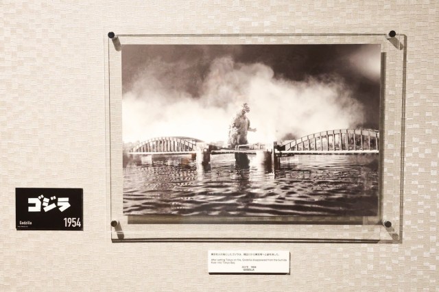 廊下の壁には歴代映画の名場面パネルが並び、歩くだけでゴジラ映画の歴史を振り返ることができる。