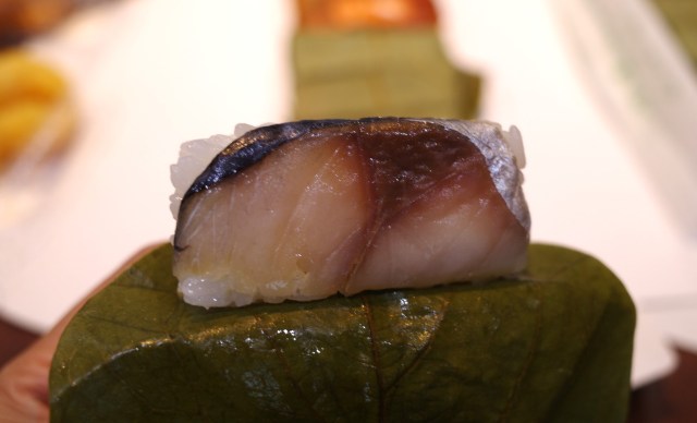 ゐざさ寿司は、中身は柿の葉寿司とよく似ているが、笹の香りが寿司に移ってまた違った味わいがある。柿の葉寿司の魚はやや肉厚で、しっかりと脂が乗っていてジューシー。米との相性も言わずもがなだ。