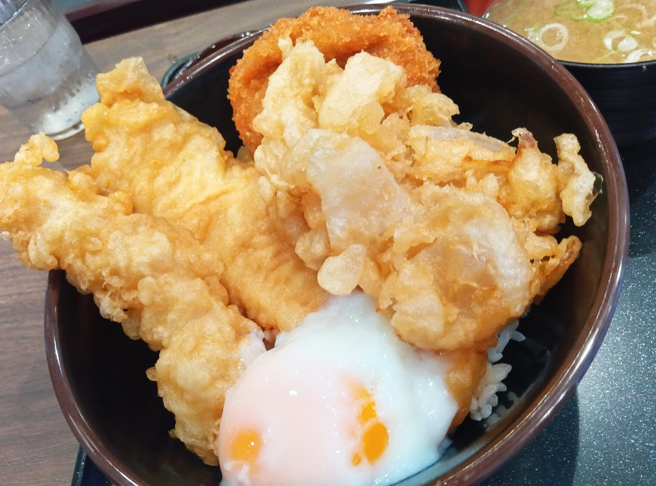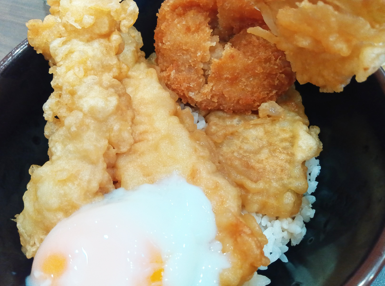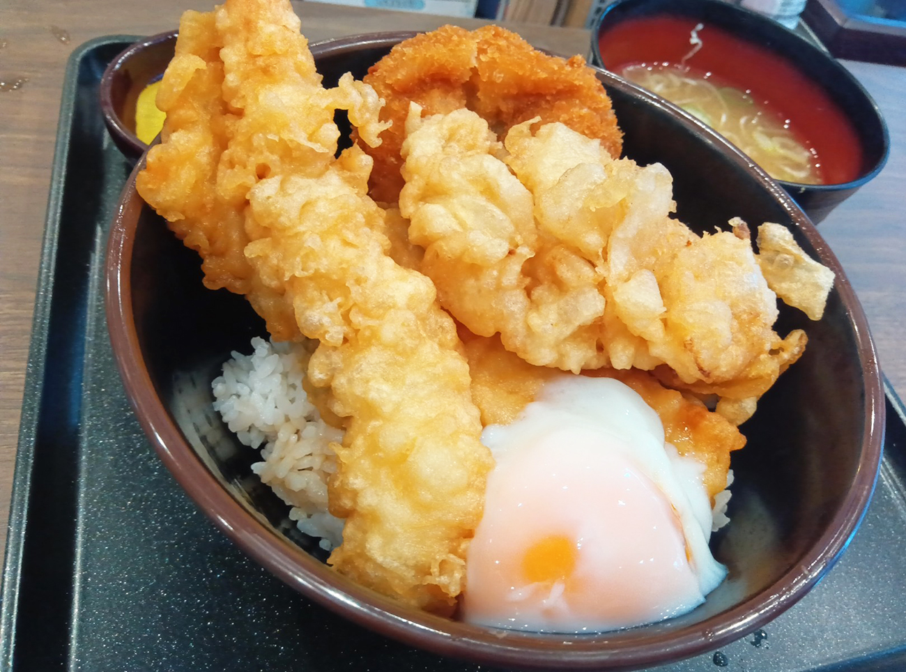 しぶそばのタレが染み染みの天丼。入っているタネは、いか天、海老天、かき揚げ天、かぼちゃ天、温玉、そして……