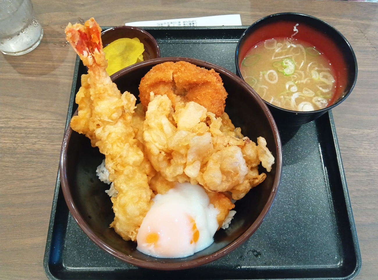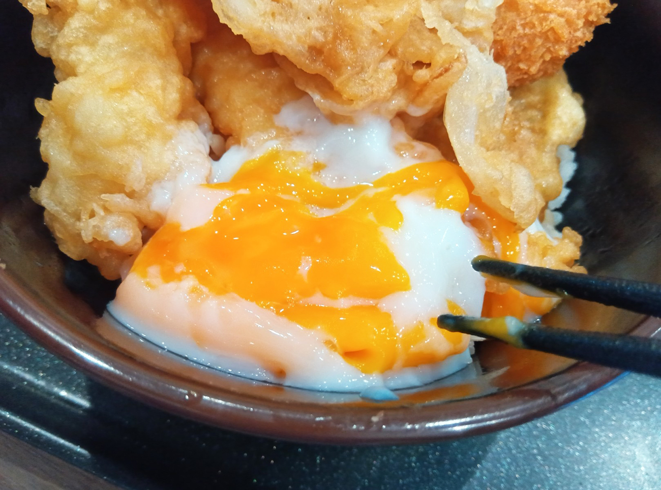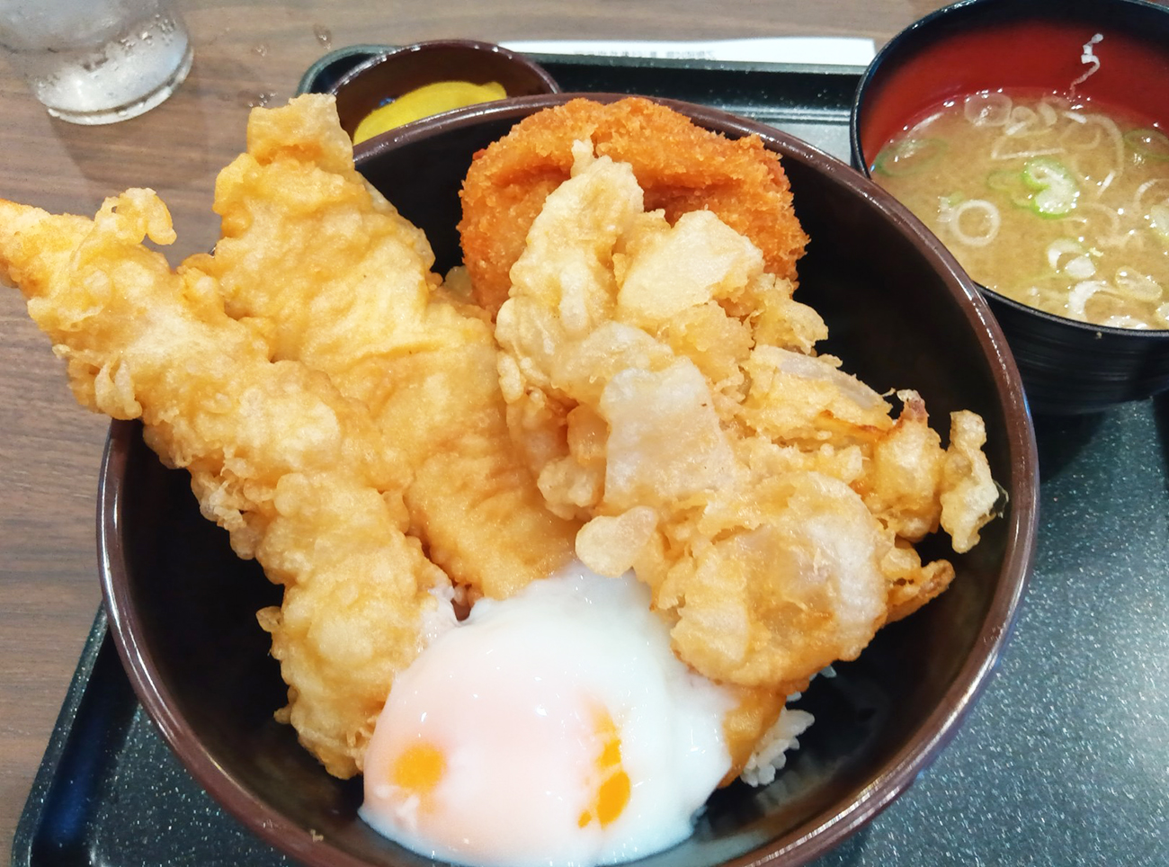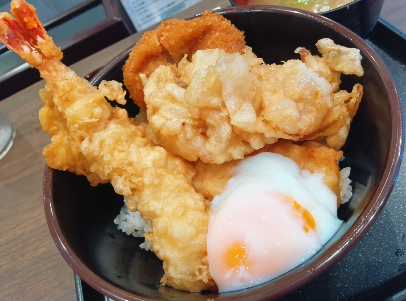 しぶそばのタレが染み染みの天丼。入っているタネは、いか天、海老天、かき揚げ天、かぼちゃ天、温玉、そして……