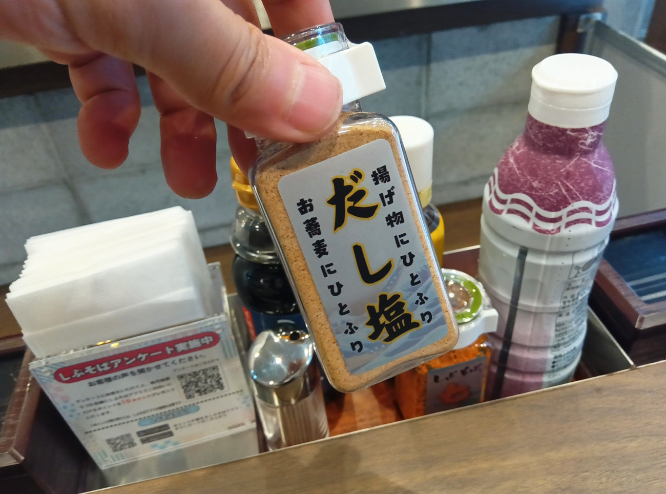 ▼ちなみに、本家しぶそばには卓上調味料にだし塩があるが……
