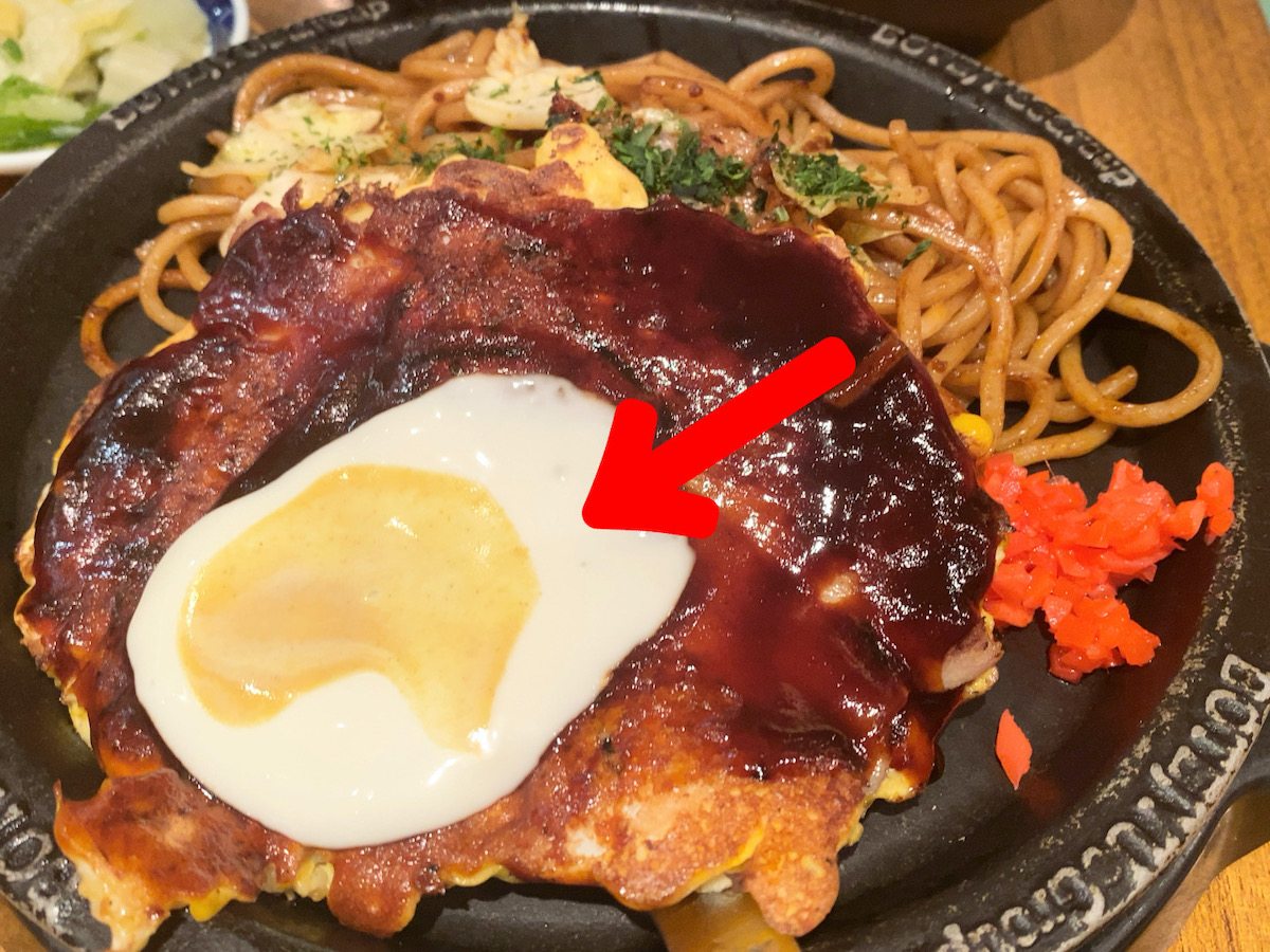 ▼たこ焼きの代わりに食べたお好み焼き焼きそばセット(1408円)。卵かと思ったら辛子でビックリ!