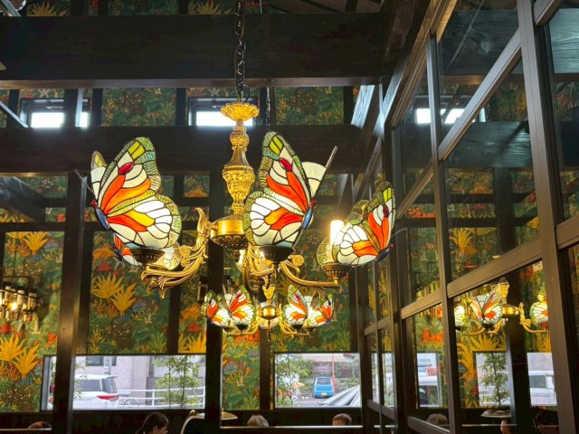 天井から吊るされたライトがとても可愛らしく、座る席によって異なるデザインなのも注目ポイントだ。