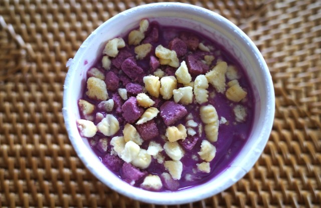 このタイプは過去にも何度か目にしたことがあるので驚きはしないものの、やはり特別感がある。クッキーだけをつまんでみると、バター効果か程よくしょっぱみもあり、紫芋の甘味と香ばしさもありで美味しい。