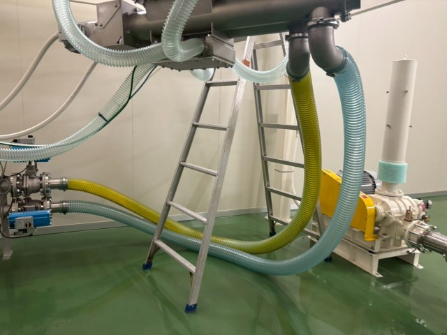 この小麦粉は、こちらのホースを使って空気の力で次の工程へと運ばれていく。