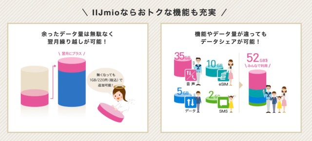 さらに! 余ったデータを翌月に繰り越せる「データ繰り越し」や、家族間で容量を分け合える「データシェア」にも対応。スマホを複数台持っている方や、家族でまとめて契約したい方にとっても便利な仕組みではないだろうか。