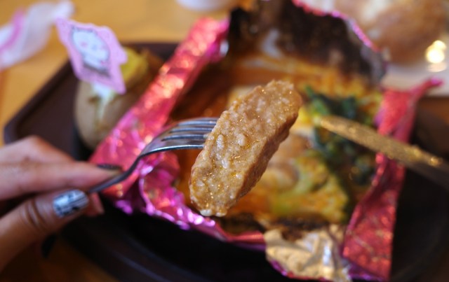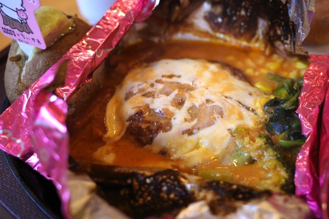 ココスの包み焼きハンバーグなのでお察しの通り、味もとても良い。白いチーズは、ちいかわをイメージしてのことだろう。ハンバーグにたっぷりかかっている。