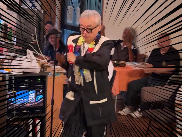 何度も何度も針を刺されるうちに「僕のほうが上手だからやりましょうか?」と冗談を飛ばして怒られた……そんな小ネタを連発して観客を笑わせていた。さらに自慢の歌声や「変なおじさん」も披露し、居酒屋は完全にショーホールと化していた。