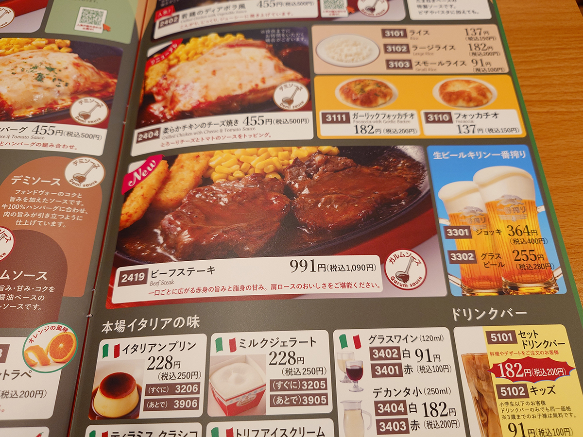 2025年10月15日に、サイゼリヤのグランドメニューが改訂された。公式HPによると、此度の改定で登場する新作メニューは「タラコフォッカチオ」と「ビーフステーキ」なもよう。