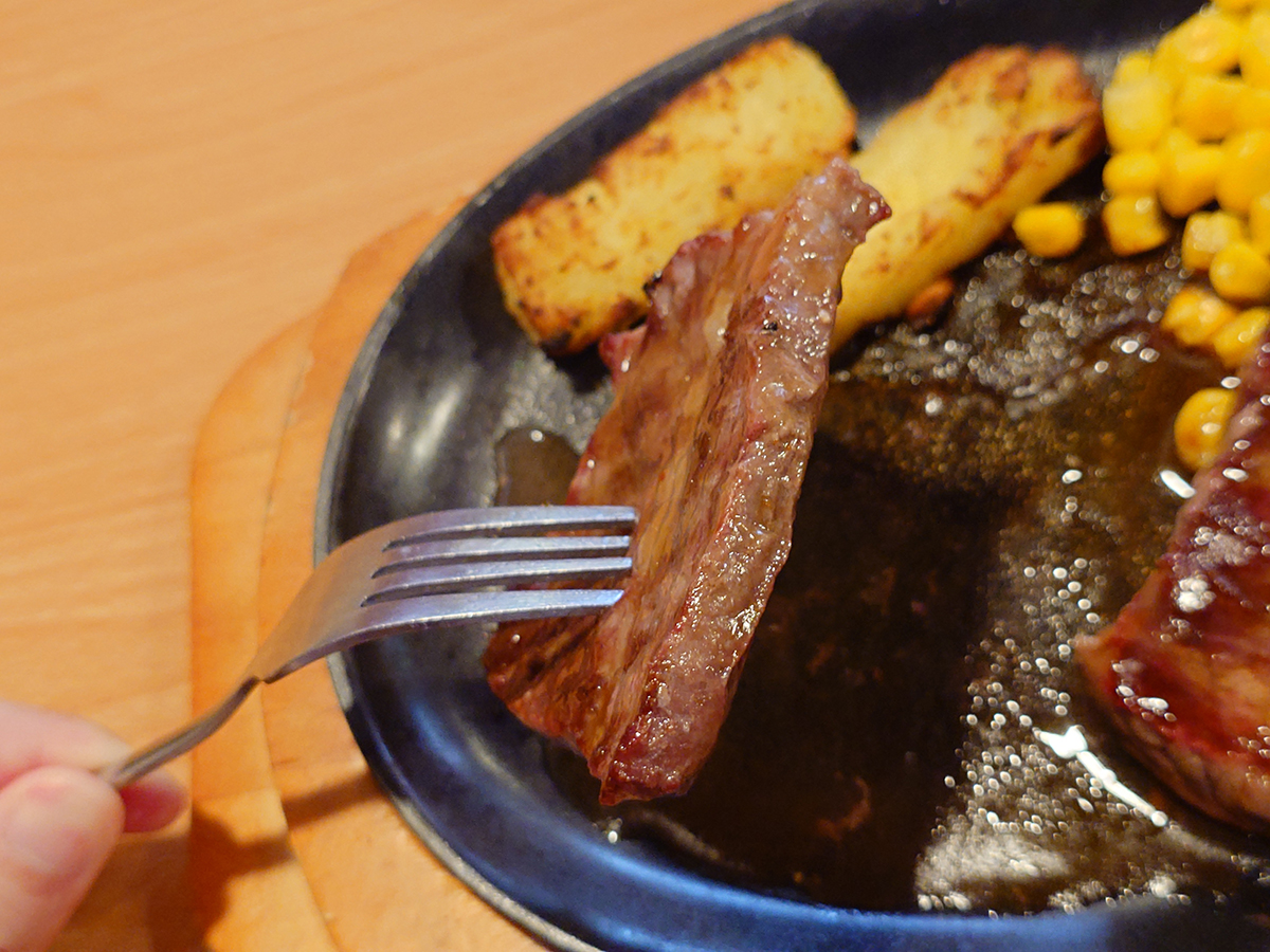 まあでも真に重要なのは肉の状態と味なので先に進もう。厚みはこんな感じ。1㎝ないくらいの薄めステーキだ。1000円分のステーキとしては、妥当な総量になると思う。