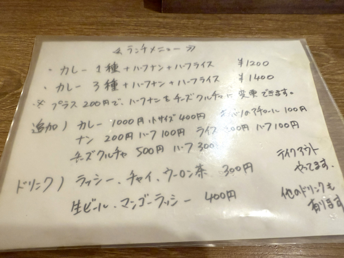 ポークビンダルーはランチ価格が「カレー1種(ハーフナン、ハーフライス付き)」で1200円。他のカレーと組み合わせ可能な「カレー3種」が1400円となっている。今回は「カレー1種(プラス200円でナンをチーズクルチャに変更)」をオーダーした。