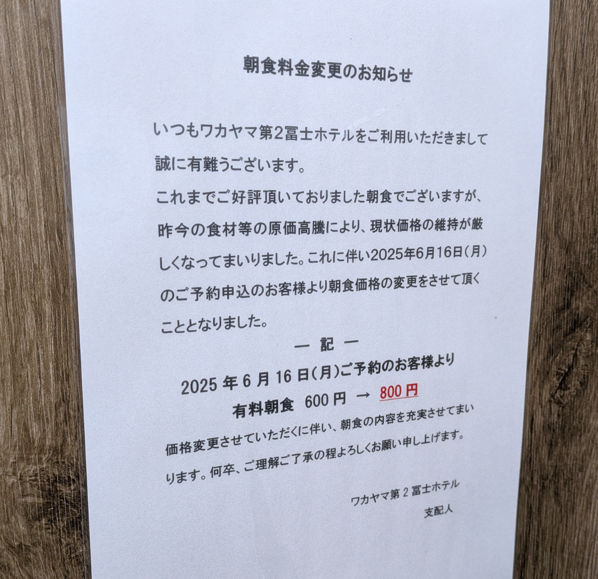 エレベーター内に施設からのお知らせがある。以前はバイキングの朝食が600円だったそうだが、原材料費の高騰により6月から800円になったそうだ。ムリもない、宿泊施設の朝食バイキングは、かなり負担が大きいはず。宿泊費だってもう少し上げたいんじゃないかなあ……。