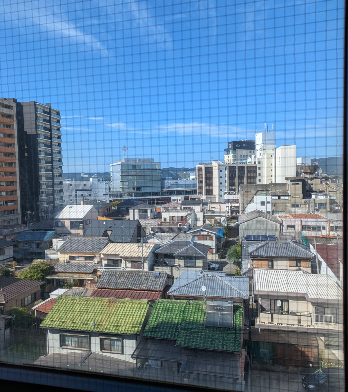 カーテンを開けると、和歌山市の街並み。向こうの方に、先ほど改札を抜けてきた和歌山市駅が見える。この辺は歴史ある街のようで瓦屋根の色合いに風情を感じる。すぐそばには川が流れていて、ホテルの真横に酒造もある。どことなくうちの地元(松江市)の街並みとも似ていて、初めてなのに懐かしさを覚える。