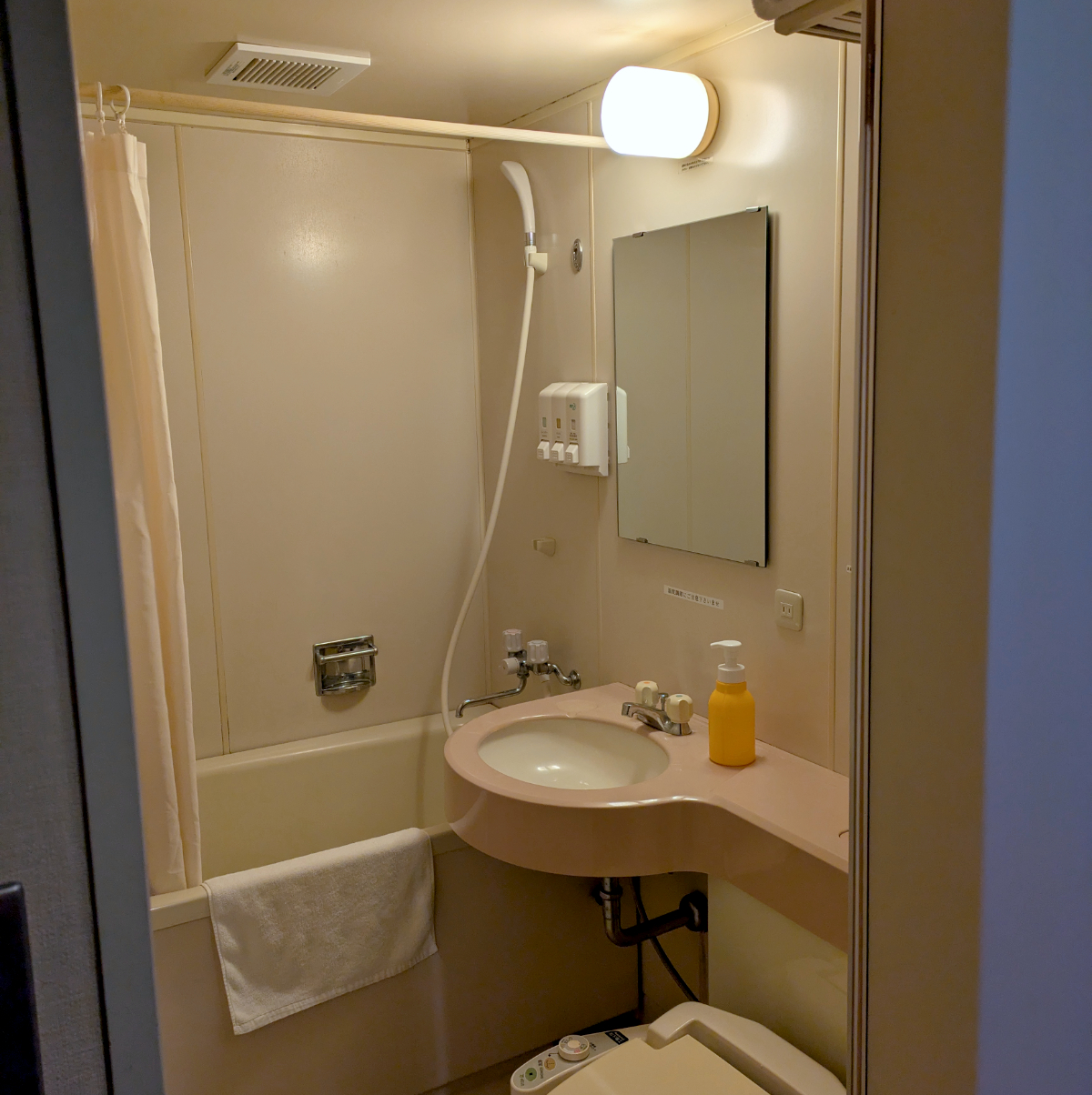 ということで、シャンプーとボディーソープをカップに取って部屋へと向かった。あとで困ったのだが、同じ形状のカップだったので、どっちがシャンプーでどっちがボディーソープかわからなかくなってしまった。何か目印をつけておけばよかったよ……。