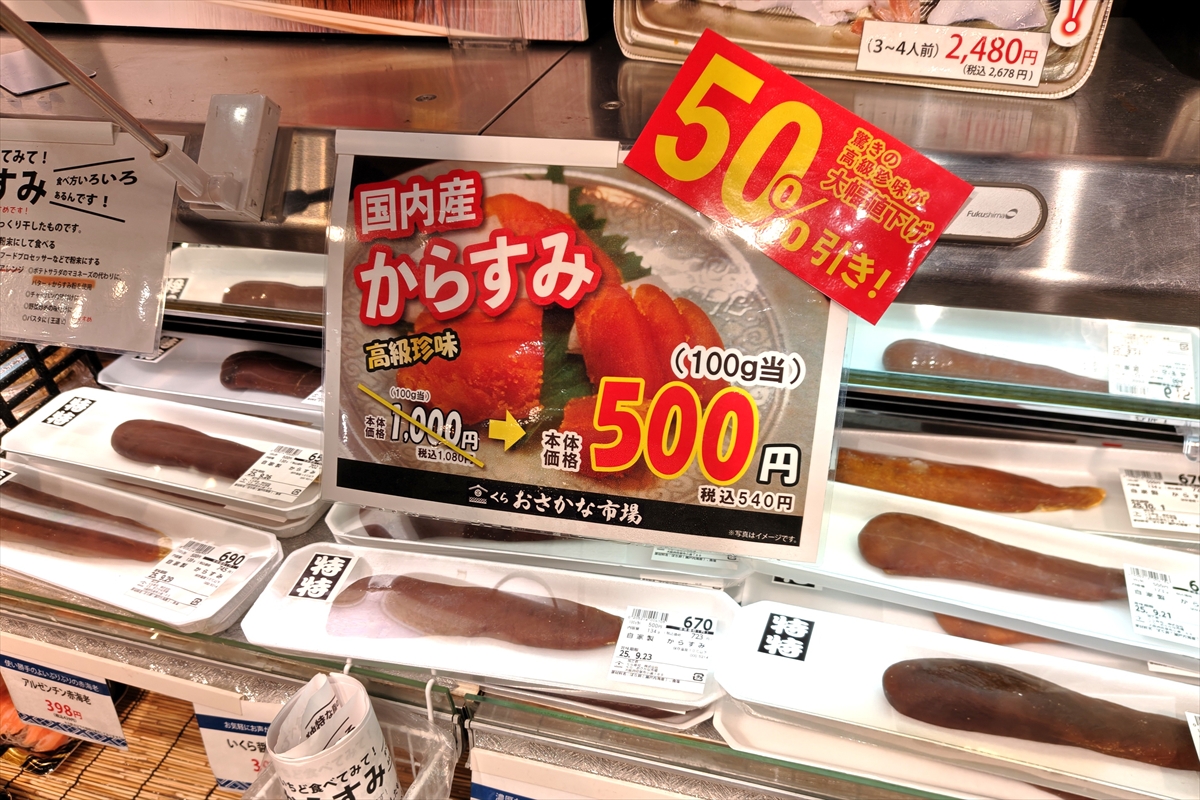 買ってよかった、くら寿司のからすみ。おさかな市場に行ったら絶対に買うべき商品のひとつだし、割引期間が終わって100g1000円になったとしても十分に価値あるお味だ。