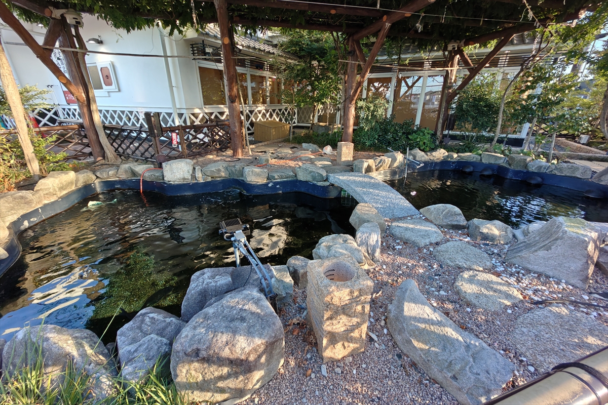 ▼屋外で国産天然魚が泳ぐ、全国的にも珍しい池なのだそう。この日はタイが元気に泳いていたぞ……って!