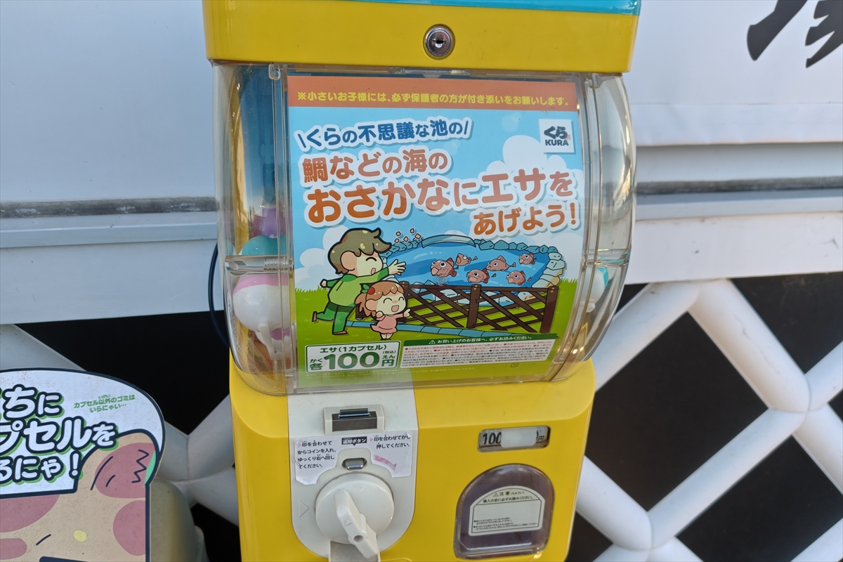 ▼ガチャガチャで餌も買える。餌に向けて勢いよく泳ぐタイは大迫力だったよ……!