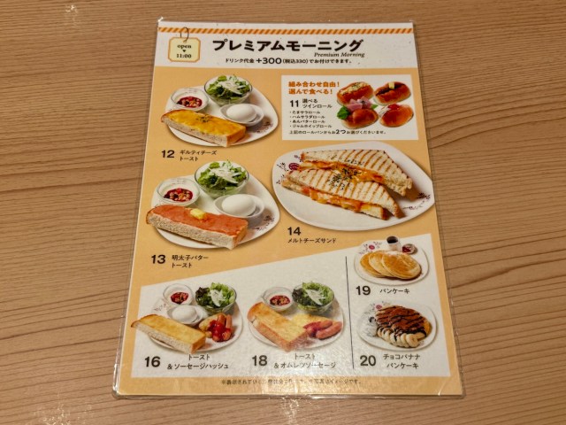同店の朝食は2種類。ドリンクを頼めばシンプルなトーストやロールパンが無料で付いてくる「モーニング」、そしてプラス330円の「プレミアムモーニング」では、メルトチーズサンドやパンケーキといった豪華な朝食を選べるのだ。
