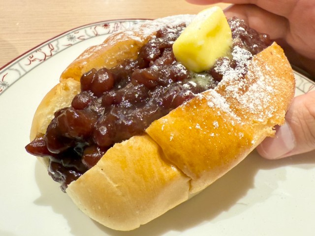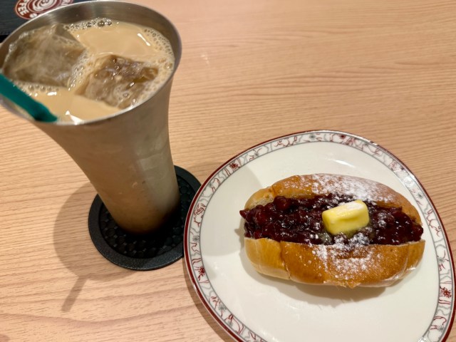 あまり待たずにセットが運ばれてきた。あんバターロールは見た目通り、あんこがぎっしりで甘さ全開。そこにバターの塩気が合わさって、いわゆる甘じょっぱさが口いっぱいに広がる。疲れが一気に癒されるタイプのロールパンだ。