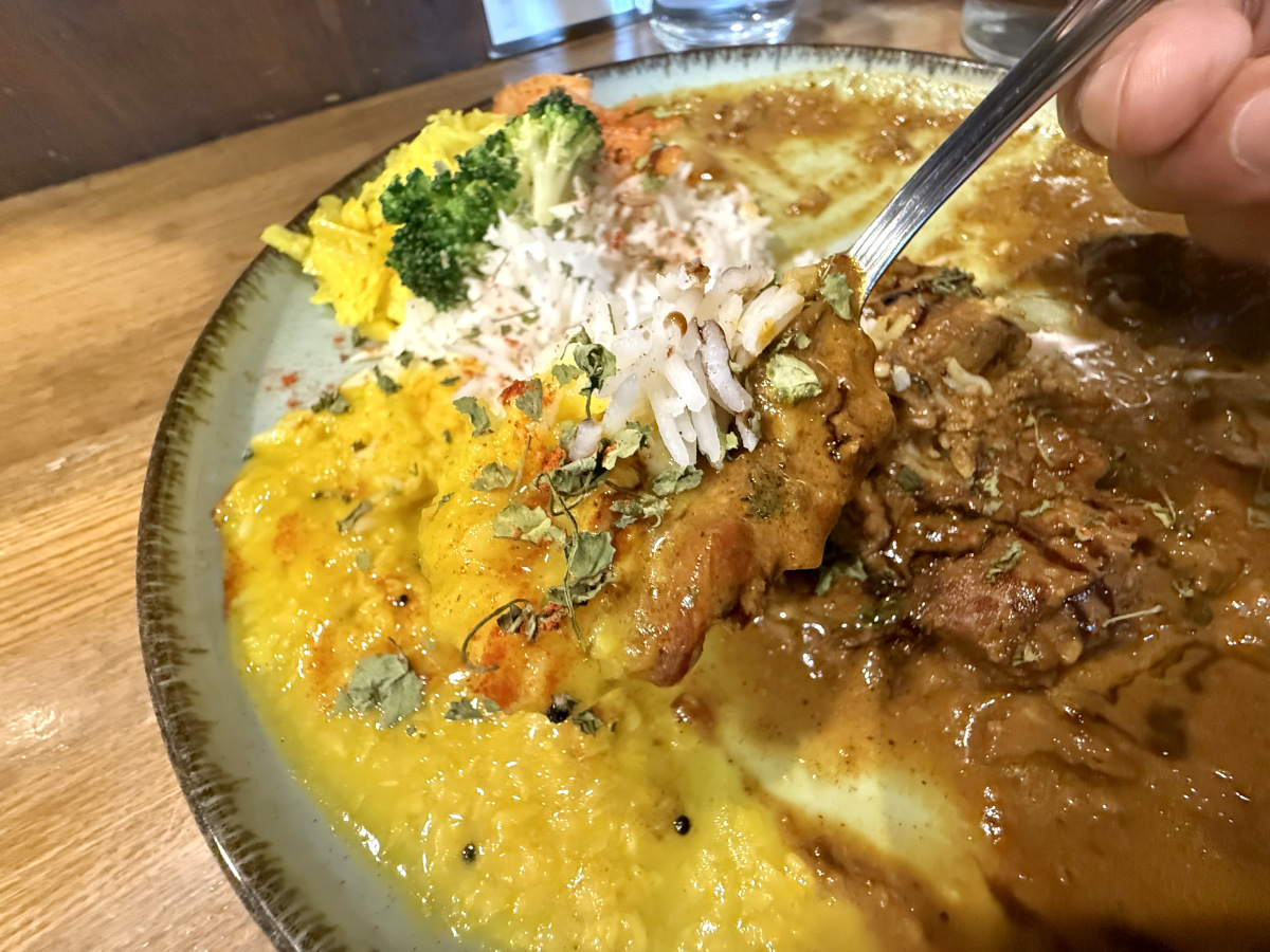 またダルを挟むと口が一瞬リセットされ、ポークビンダルーが鮮度よく食べられる。サラサラとしたバスマティ米との相性も良く、あっという間に完食していた。ここのポークビンダルーも美味しかったなぁ~。