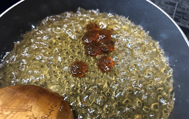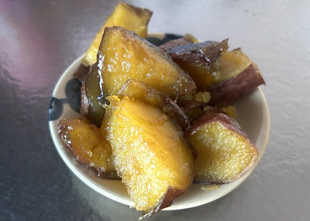 なんでも、お湯で溶かしたカンロ飴をサツマイモと絡めるだけで、大学芋のようになるらしい。その通りにタレを作り、軽く温めたサツマイモをドボン。あっという間に完成だ。