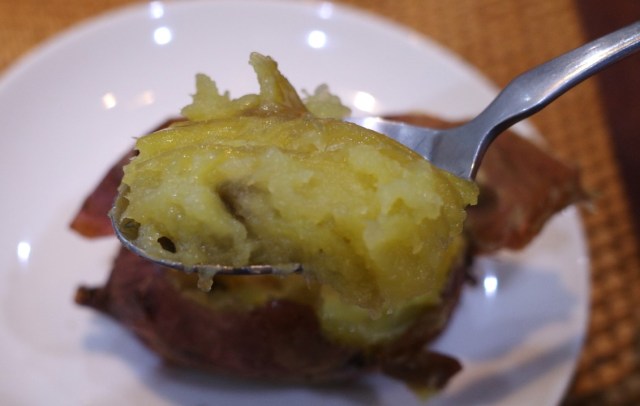 あつあつの芋を半分に割ると、さらにびっくり。感触や芋の様子など、どこをとっても、やはり焼き立てのよう。そして食べてみると、これまた石焼き芋の味がしてすごい。