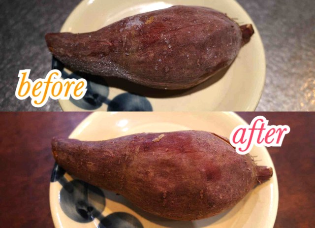 レンジに入れる前の芋はカチコチだが、見た目は焼き立ての芋そのもの。驚くのは温めてレンジから取り出してなお、ビジュアルをキープしていることだ。