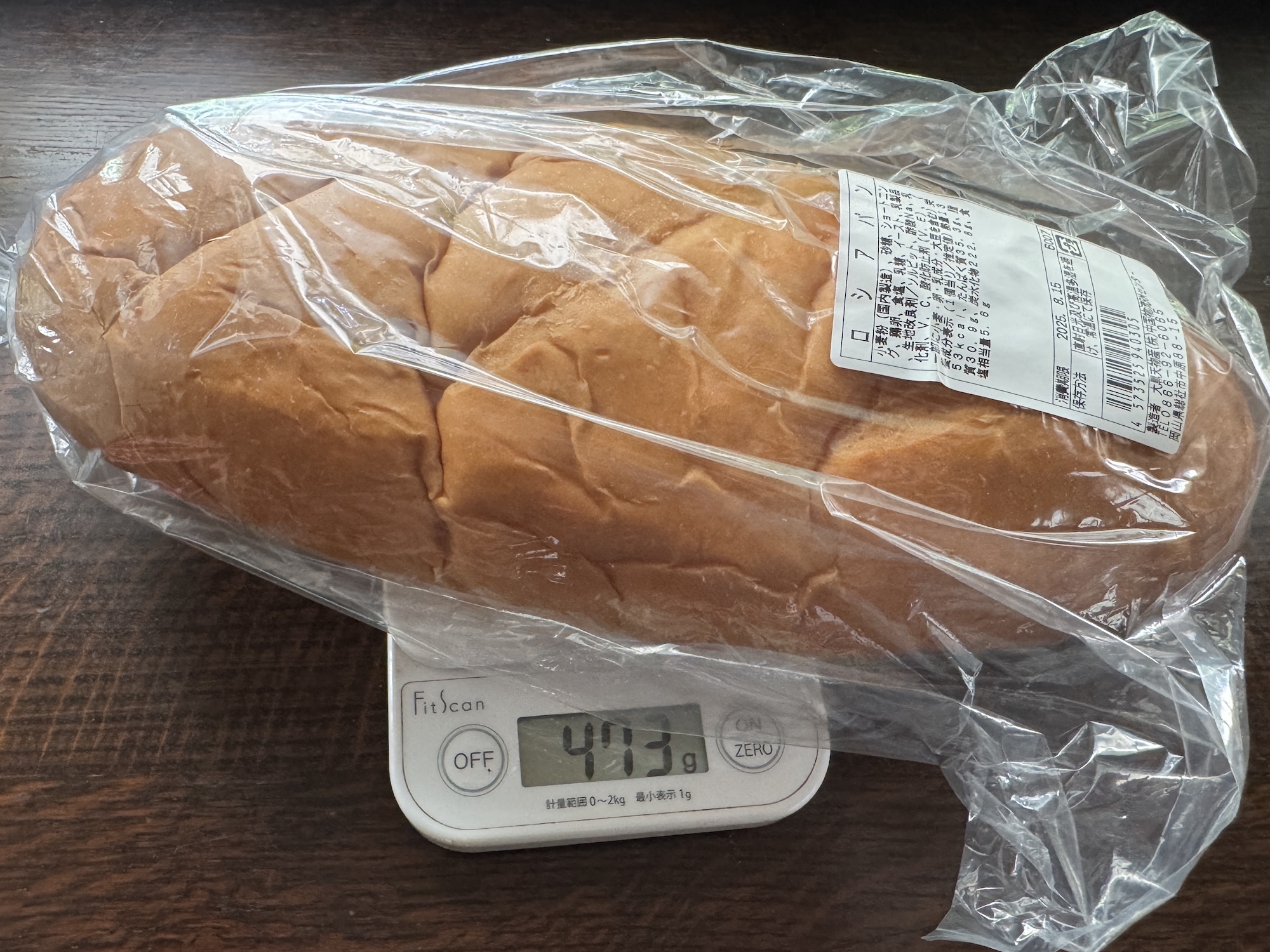 なおラ・ムーのフランスパン(105円)は重量424グラム、982kcal。