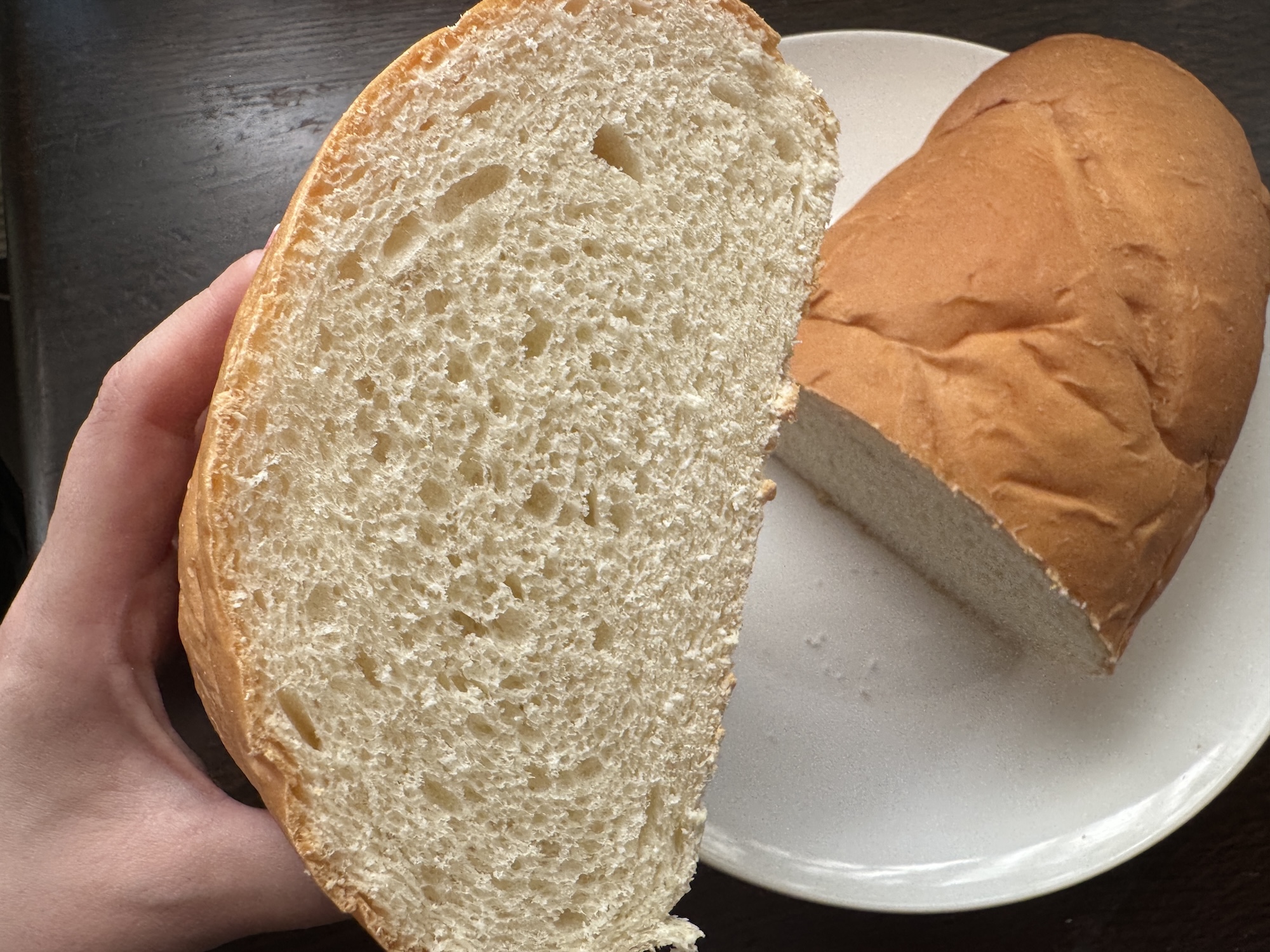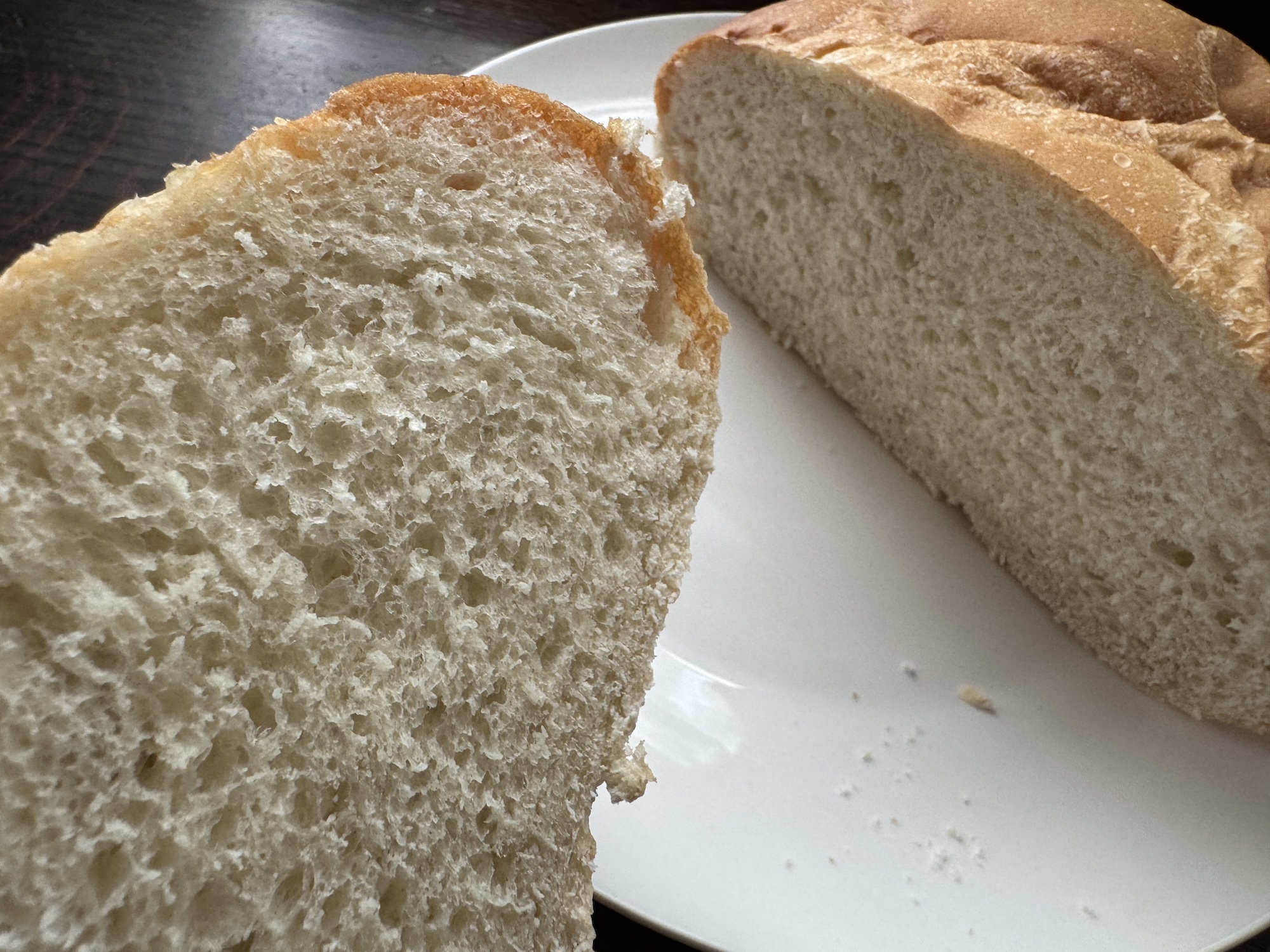 ん〜、イーストのいいにおい! 断面はどう見ても日本のパンだが、果たしてフランスパン要素は見つかるのだろうか?