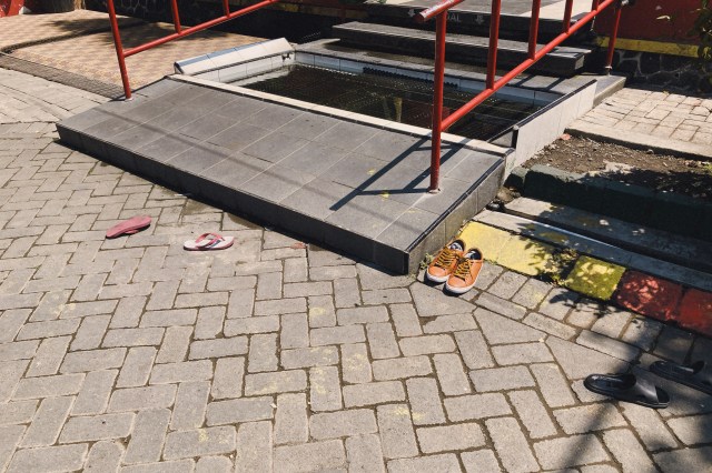 モスクに入るには正面からではなく、ここ足洗い場のある横からモスクの敷地内に入る。モスク内は靴も靴下も脱がなければいけないのでここで脱ぐが、靴を安全に保管できるロッカーみたいなところはなかった。