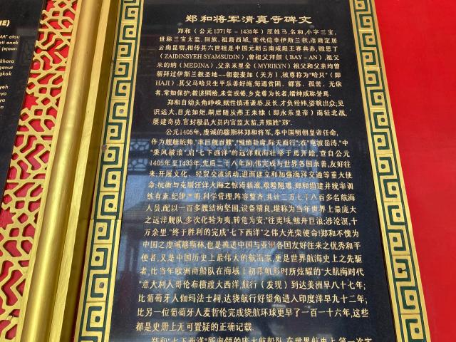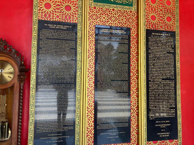 モスク内に入ると3つの碑文がお出迎えしてくれる。ここには鄭和の生い立ちとこのモスクを建設するにあたっての思いが英語・インドネシア語・中国語で書かれてある。