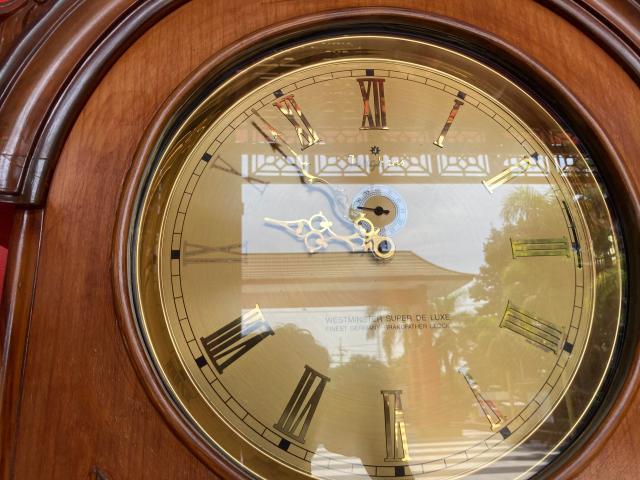 碑文の横にはマジモンの機械式振り子時計。ここで時計好きの僕がまたまた大興奮。