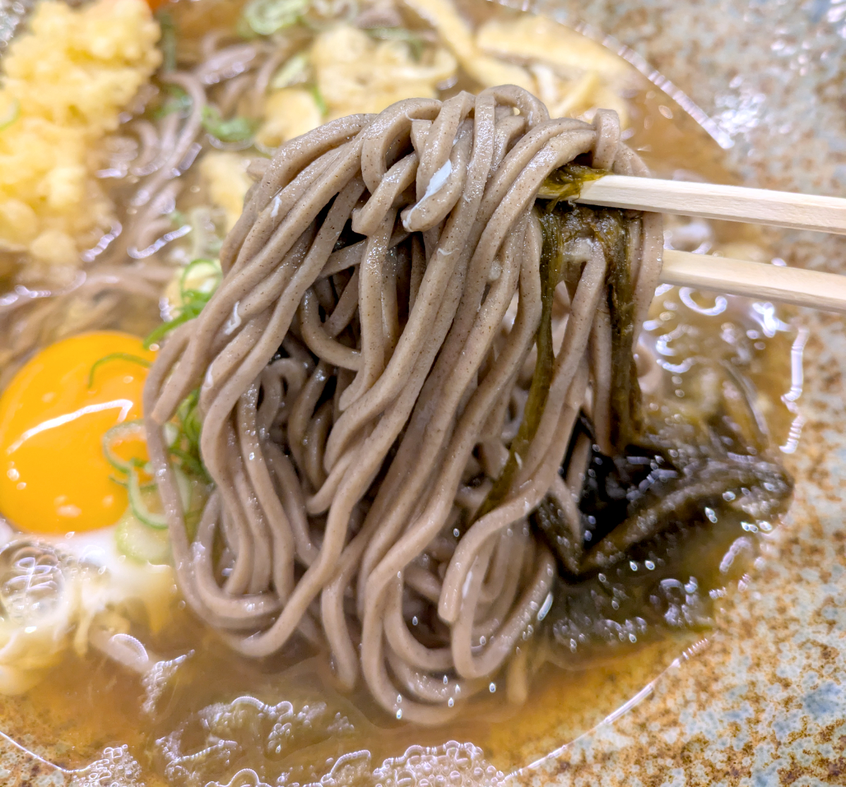 630円と侮るなかれ。「スペシャル」と名が付いている通りに、トッピングは豪華だ。ネギ・とろろこんぶ・刻んだお揚げ・生卵、それに海老天まで入っている。