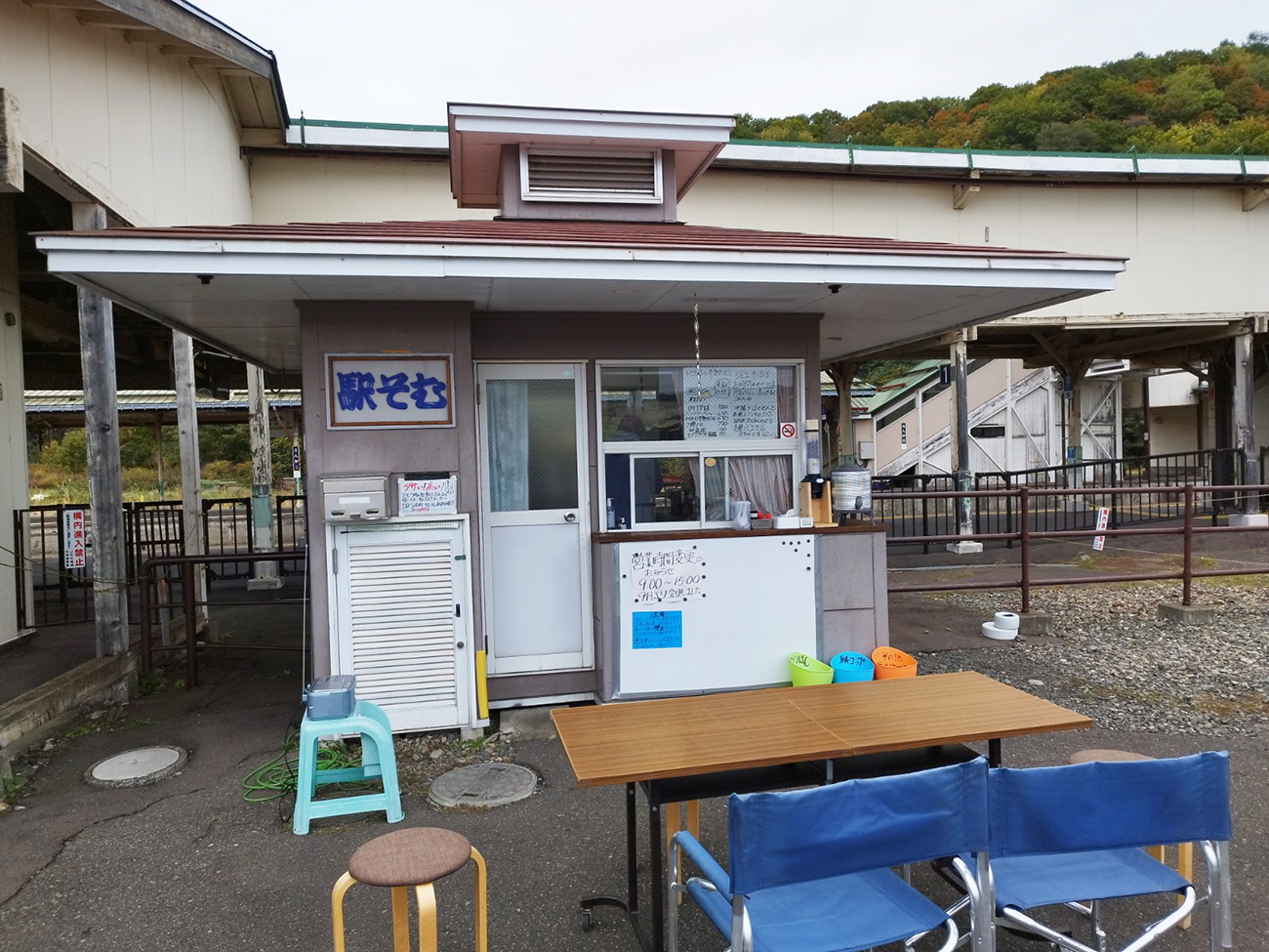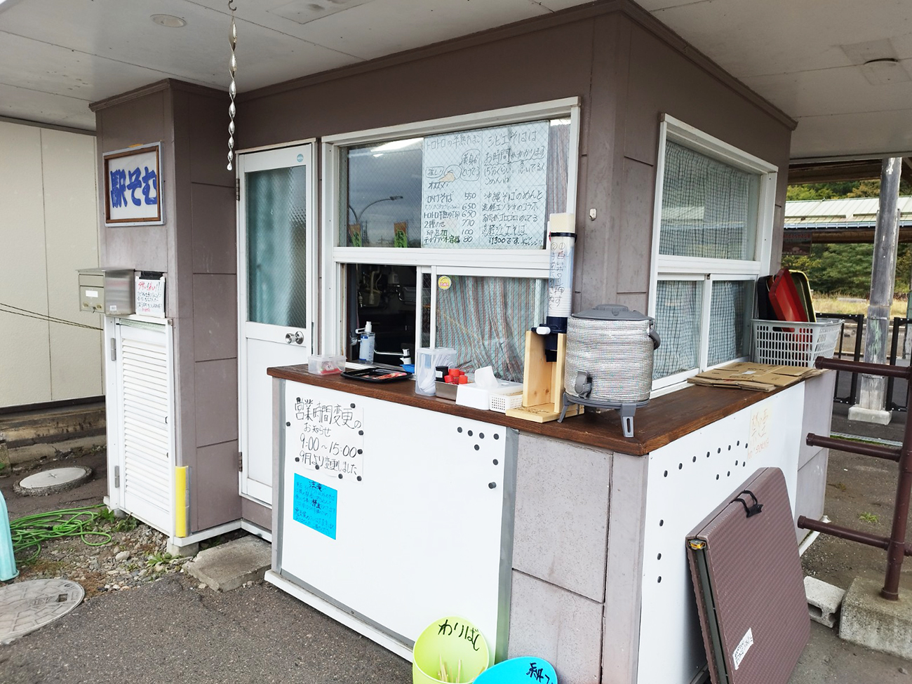 北一そば店は駅舎の影に隠れるように佇んでいた。厨房とカウンターのみの建物。どうやら間に合ったようでカウンターはまだオープンしている。席は前のちょっとした広場にデスク机と簡易的な椅子が置かれていた。この寒さと相まって、どことなく寂しさが漂う。最果てオーラが凄いんよ。