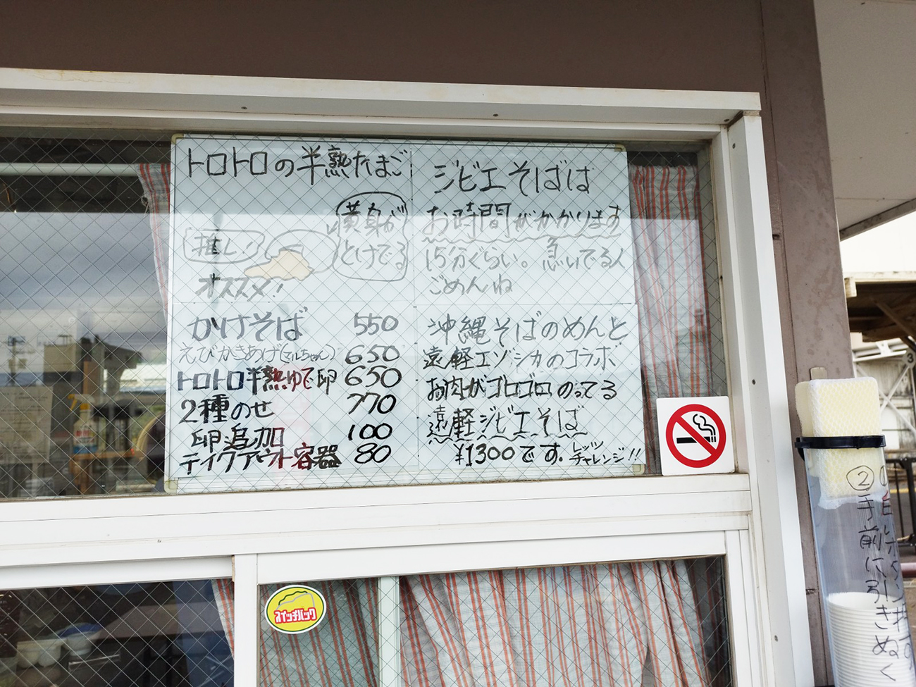 また、メニューの少なさも最果て感を演出する。ふむふむ、かけそば(税込550円)に半熟卵をトッピング(税込650円)するか、えびかき揚げ天をトッピング(税込650円)するか、両方か(税込770円)というスタイルか。って……