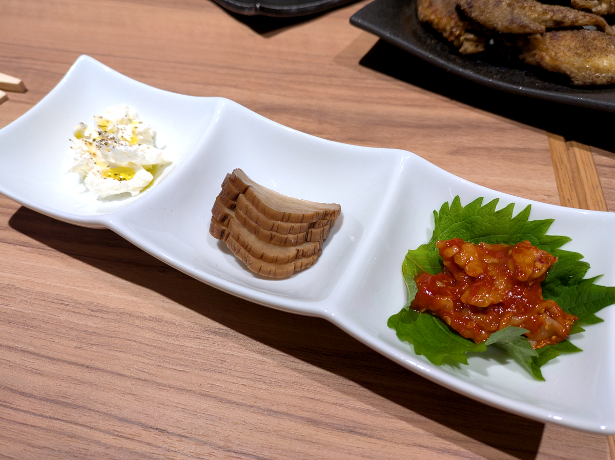 続いてささやかなツマミとしてオーダーしたのは、「クリームチーズとチャンジャ」(税込858円)。いぶりがっこ付きで酒の肴にちょうど良い。