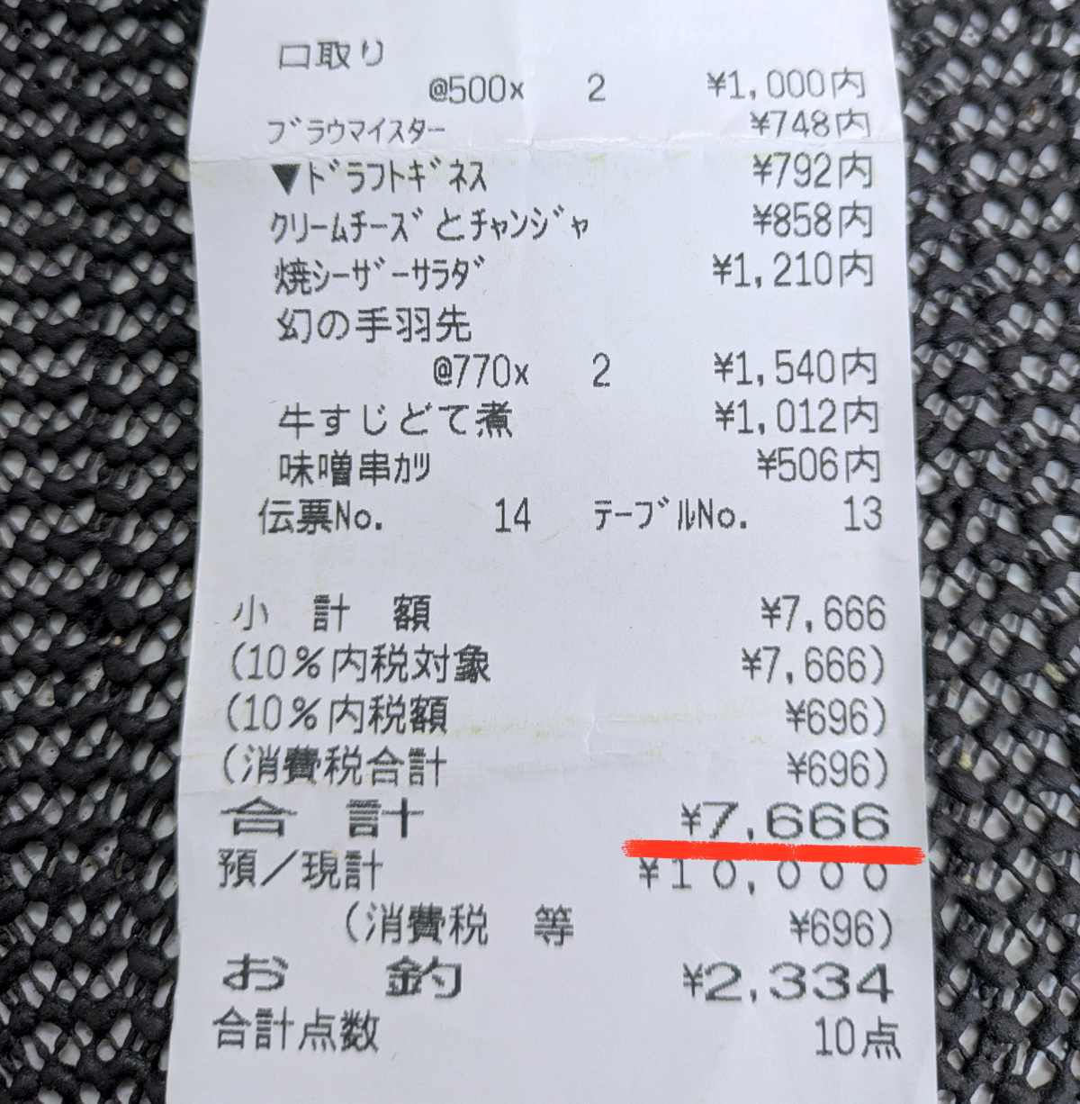それで結局お会計はというと、2人で1杯ずつビールを飲んで税込7666円でした。高価なメニューを避けた結果、支払い金額は山さんではなく、山ちゃんレベルで済ますことができましたよ。
