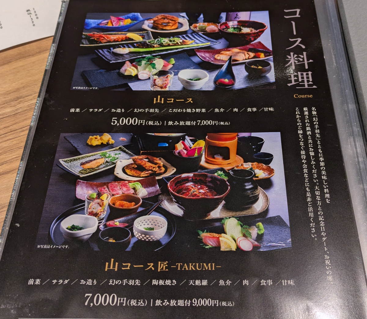 さらにさらにコース料理もありました。通常の「山コース」は税込5000円。ひとつ上の「山コース匠」は税込7000円だ。単品で頼むならコースをオーダーした方が割安かも。とはいえ、もう完全に居酒屋ではないな。
