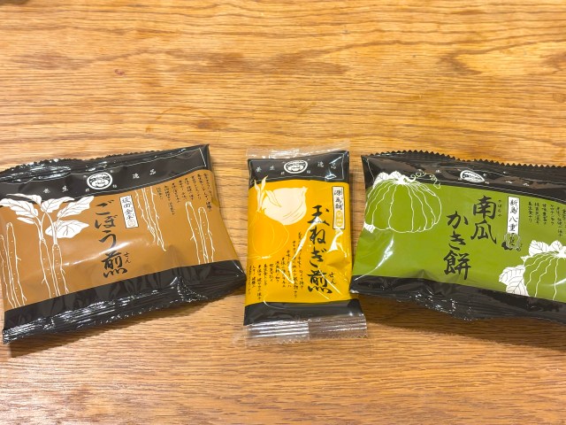 いっぽうの「東京野菜おかき」は、玉ねぎ煎×6袋、ごぼう煎×3袋、かぼちゃかき餅×3袋のつめ合わせで薬1000円。