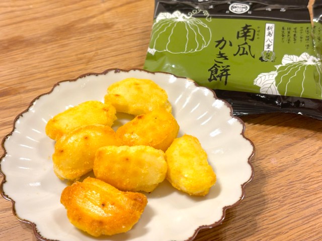 「かぼちゃかき餅」はふわっと丸いおかき。これはかぼちゃの甘くて優しい風味が口いっぱいに広がる。濃厚なカボチャのポタージュスープをそのままおかきにしたような味わい。